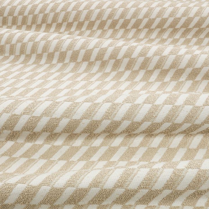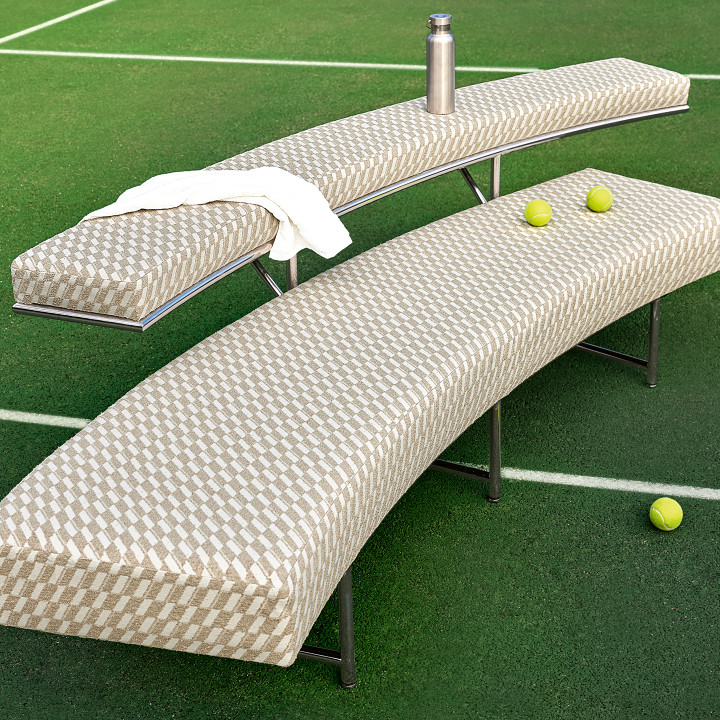 Originally designed in the Kirkby studio, this 75% recycled polypropylene outdoor weave is a nod to the graphic markings of a tennis court. A soft boucle yarn creates a bold, geometric design in a palette of unique colours that pays homage to the retro combinations found in classic leisurewear.
